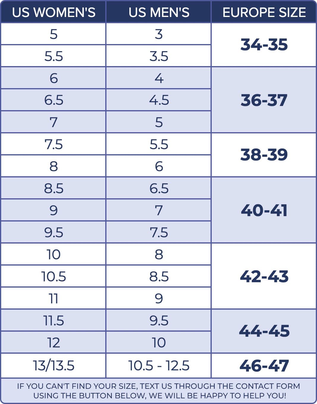 | 23 - 23.5 cm | 6 - 7 | 4 - 5 | 36 - 37 |